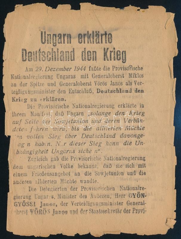 1945. I. 3. Az ideiglenes magyar kormány röplapja a német katonáknak a németek elleni hadüzenetről. Sérült. / The provisoric Hungarian goverment's flyer for the German troops about the declaration of war against Germany