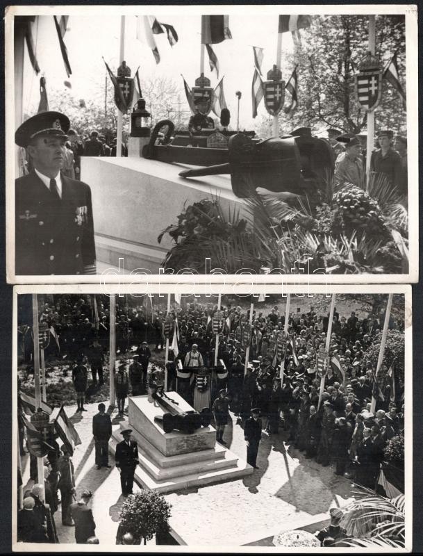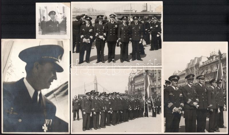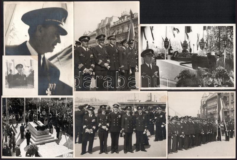 cca 1942 Vegyes, folyamőrséggel kapcsolatos fotó tétel, 7 db, 4 fotón azonosítatlan ünnepséggel, 3 fotón ünnepséggel az "Ungvár" Duna-tengerjáró hajó hősi halottainak állított emlékműnél, (Csepeli Szabadkikötő?), egy hátoldalán pecséttel (Orelly Fotó), kis kopásnyomokkal, két fotó sarkán cellux-szal, és gyűrődésnyommal, 12x17 cm és 9x6 cm közötti méretben