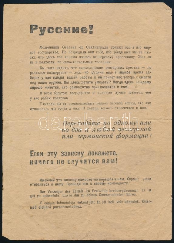 cca 1943 Német propaganda röplap orosz katonák részére magyar nyelvű szöveggel is a Keleti fronton / German propaganda flyer for the Soviet soldiers on the Eastern Front