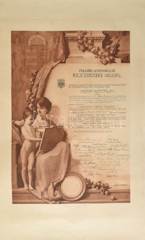 1919 Polgári leányiskolai rajztanítónői oklevél a kor neves képzőművészei, tanárai aláírásaival: Szinyei Merse Pál (1845-1920) festőművész, a Képzőművészeti Főiskola igazgatója, Schulek Frigyes (1841-1919) építész, Réti István (1872-1945), a Képzőművészeti Főiskola későbbi rektora, Glatz Oszkár (1872-1958), Lyka Károly (1869- 1965), Edvi Illés Aladár (1858-1927), Pécsi-Pilch Dezső (1888-1949), Erdőssy Béla (1871-1928), Nádler Róbert (1858-1938), Dörre Tivadar (1858-1932), Loránfi Antal (1856-1927), Gyulai Ágost (1868-1957), Bosznay István (1868-1944), Révész Imre (1859-1945) és mások autográf aláírásaival, díszes illusztrációval, szárazbélyegzővel, hátoldalán anyakönyvi kivonattal, feltekerve. Róna Katalin, Róna József (1861-1939) szobrász lánya részére.