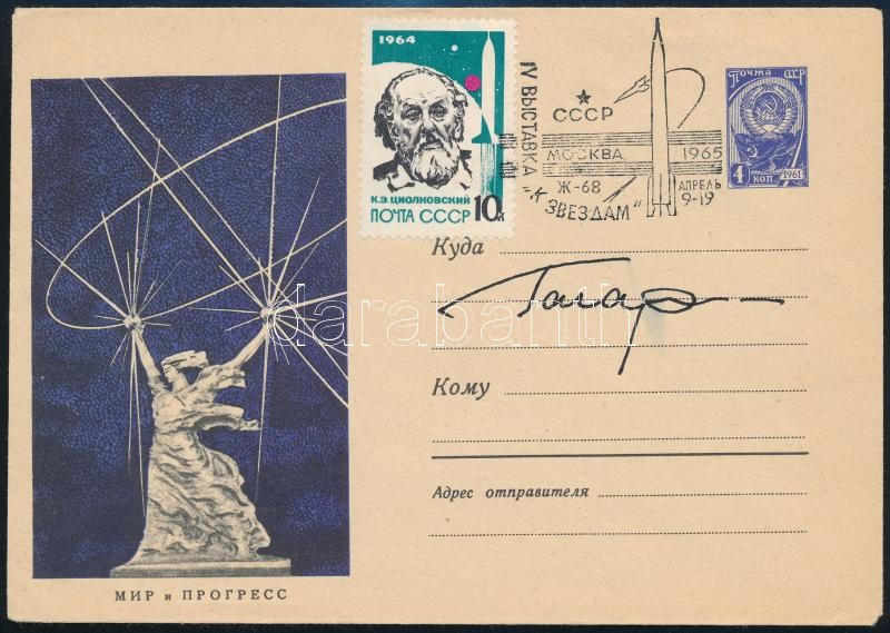 1965 Jurij Alekszejevics Gagarin (1934-1968) szovjet űrhajós autográf aláírása borítékon alkalmi bélyegzéssel. / Autograph signature of Yuriy Alekseyevich Gagarin (1934-1968) Soviet astronaut on cover with special cancellation