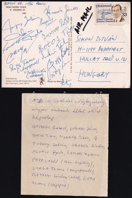 1986 Reno, az Egyesült Államokban rendezett ökölvívó világbajnokság magyar résztvevőinek aláírása képeslapon: Papp László (1926-2003) szövetségi kapitány, Varga Ferenc csapatvezető, Csötönyi Sándor edző, Botos Tibor, Váradi János, Isaszegi Róbert, Molnár Tibor, ifj. Füzesy Zoltán, Hranek Sándor, Alvács Gyula, Somodi Ferenc, Roth Ferenc