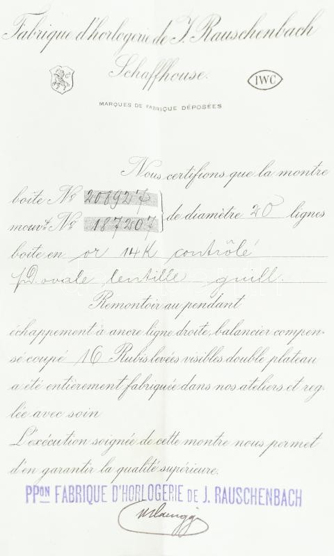 IWC Shaffhausen zsebóra szerkezet, eredeti tokkal, eredeti okmánnyal, egyező sorozatszámmal. Szerekzet működik, számlap jó állapotban. / IWC pocket wach mechanics with original box and matching document