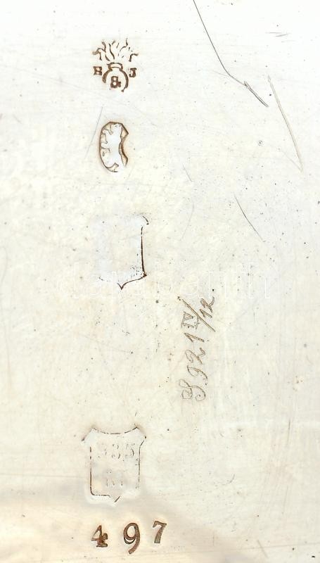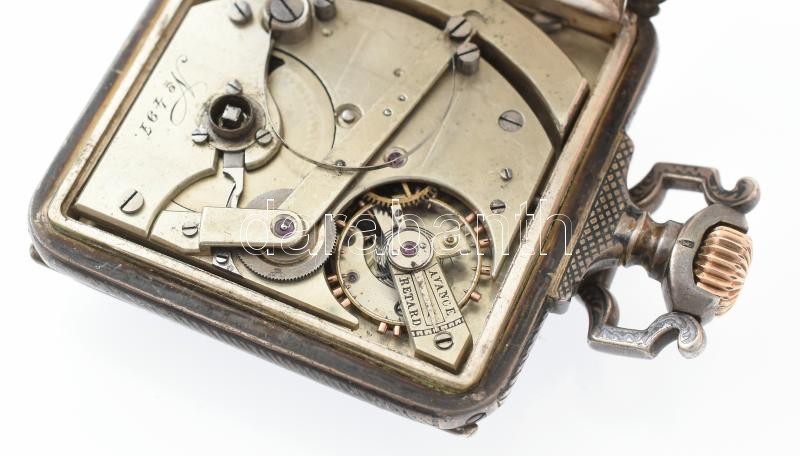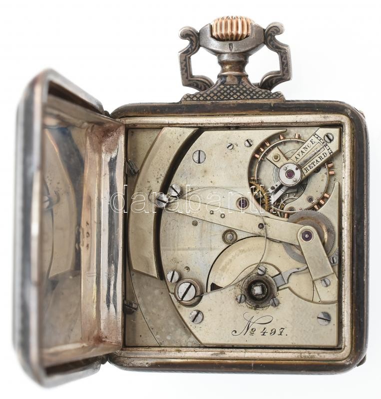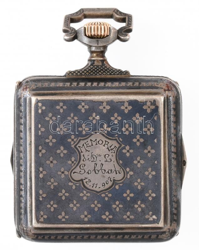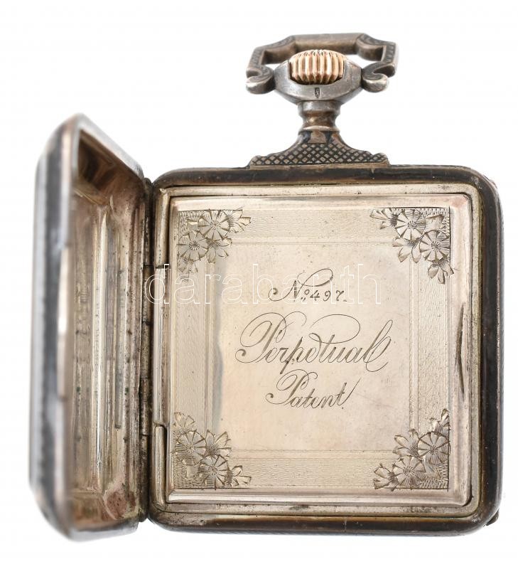 cca 1880 Loehr perpetual patent niellós ezüst zsebóra automata nikkelezett kalapácsos, kulcsos felhúzású szerkezettel. Jelzett tok, szerkezet. Járástartalék kijelzéssel. Tokszám, szerkezetszám: No. 497. Jelzett ezüst. Későbbi ajándékozási sorral a tokon. Másodpercmutatók hiányoznak számlapon sérülés. Nem jár. Nagyon ritka, különleges óra. Hasonló óra szerepel Reinhard Meis, Taschenuhren, Callwey, 1999, 141 oldalon. / Loehr perpetual patent silver, key-wound pocket watch. Nickel finished 3/4 -plate movement jewelled to the centre with cut bimetallic compensated balance to lever escapement, hammer shaped perpetuelle weight, the white enamel dial with some crack. Two dials missing. Needs repair. 50x50 mm