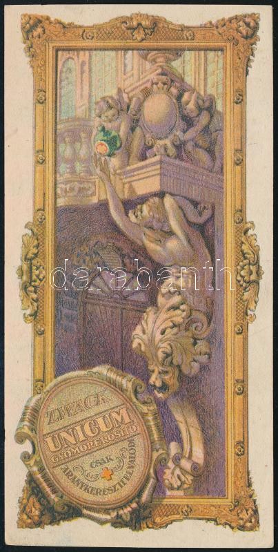 Beschreibung: cca 1910 Zwack Unicum gyomorerősítő díszes számolócédula, 13,5x6,5 cm