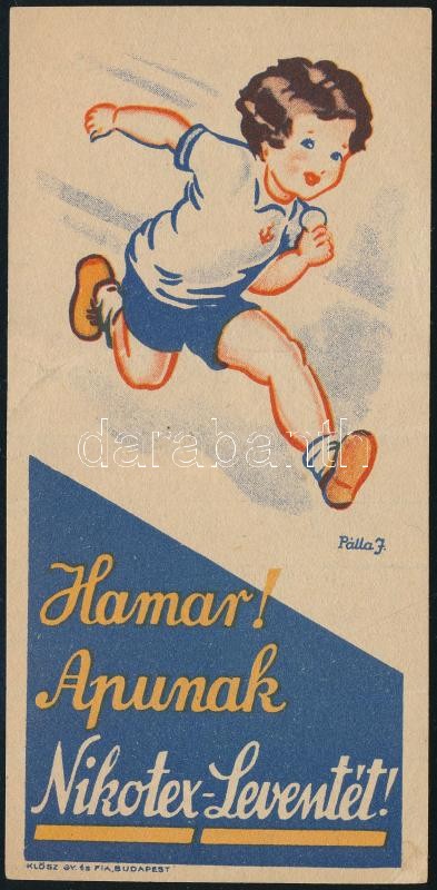 cca 1930-1940 Nikotex-Levente cigaretta reklám számolócédula, Pálla Jenő (1883-1958) festő, grafikus illusztrációjával, Klösz Gy. és Fia Bp., 13,5x6,5 cm