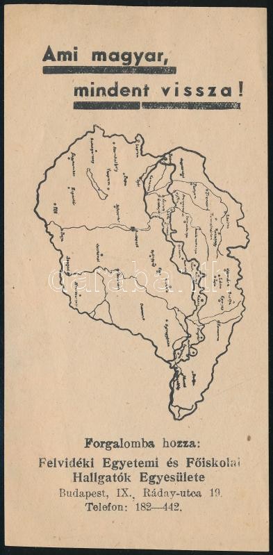 cca 1940 Ami magyar, mindent vissza! Felvidéki Egyetemi és Főiskolai H... https://www.darabanth.com/de/36-Gross-Auktion/36.1/Kunst-Dokumente-andere-Sammelgebiete/Werbungen~15151/cca-1940-Ami-magyar-mindent-vissza-Felvideki-Egyetemi-es-Foiskolai-Hallgatok-Egyesulete-Bp-i~II2490167