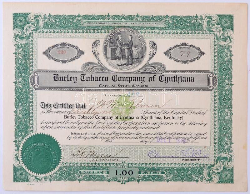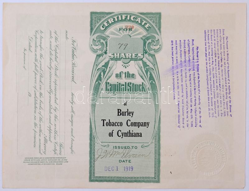 Amerikai Egyesült Államok 1919. "Burley Tobacco Company of Cynthiana" hetvenkilec részvénye egyben összesen 79$-ról, felülbélyegzésekkel T:I- / USA 1919. "Burley Tobacco Company of Cynthiana" seventy-nine shares in one about 79 Dollars in sum total, with overprints C:AU