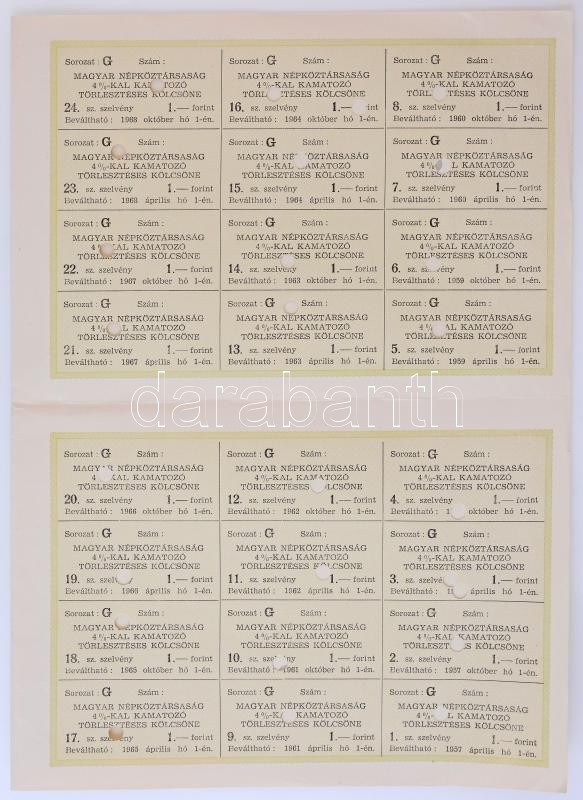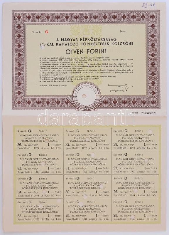 Budapest 1957. "Magyar Népköztársaság 4%-kal kamatozó törlesztéses kölcsöne" 50Ft értékben, "G" sorozat, szelvényekkel, szárazpecséttel, lyukasztásokkal érvénytelenítve T:I-,II / Hungary 1957. "Magyar Népköztársaság 4%-kal kamatozó törlesztéses kölcsöne" State Loan bond in worth of 50 Forint, "G" Sorozat with coupons, embossed stamp and cancellation C:AU,XF