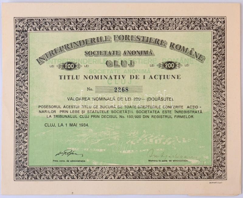 Románia / Kolozsvár 1934. "Intreprinderile Forestiere Romane Societate Anonima (Romániai Erdészeti Részvénytársaság)" részvény 200L-ről, szelvénnyel, szárazpecséttel T:I- / Romania / Cluj 1934. "Intreprinderile Forestiere Romane Societate Anonima" share about 200 Lei with coupon and embossed stam C:AU