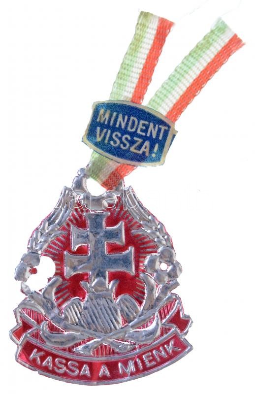 ~1938. "Kassa a mienk" festett Al lemezérem "Mindent vissza!" feliratú, nemzetiszínű szalagon (0,13g) lyukasztva, kis berepedések / Hungary ~1938. "Kassa (Košice) is ours" painted Al with "Everything back!" text, on a national color ribbon (0,13g) holed, little cracks