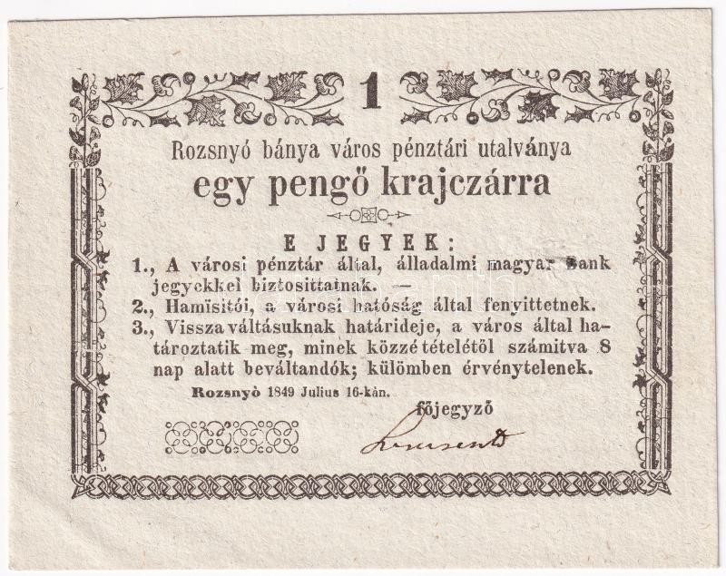 Rozsnyó 1849. július 16. 1kr "Rozsnyó bánya város pénztári utalványa" T:I- egy helyen elvékonyodott papÃr / Hungary / Rozsnyó 16.07.1849. 1 Kreuzer "Rozsnyó bánya város pénztári utalványa (Cashier's Coupon of Mine Town of Roznava)" C:AU at one spot thinner paper Adamo ROZ-1.1
