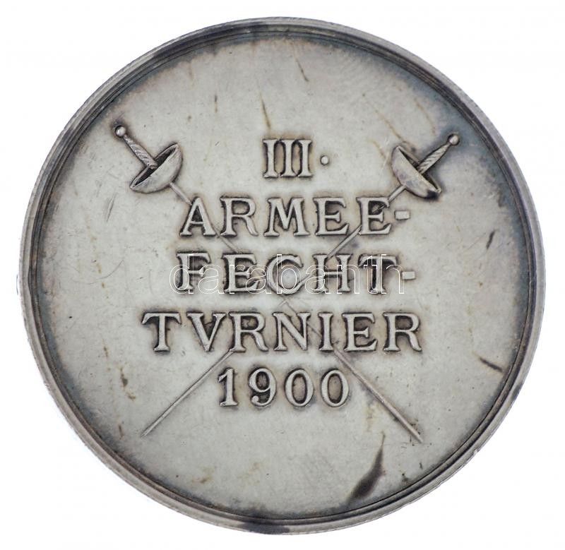 Ausztria 1900. "III. Armee Fechtturnier 1900" jelzett Ag vívósport emlékérem (16,96g/0.800/37mm) T:1-,2 / Austria 1900. "III. Armee Fechtturnier 1900" hallmarked Ag fencing sport commemorative medallion (16,96g/0.800/37mm) C:AU,XF