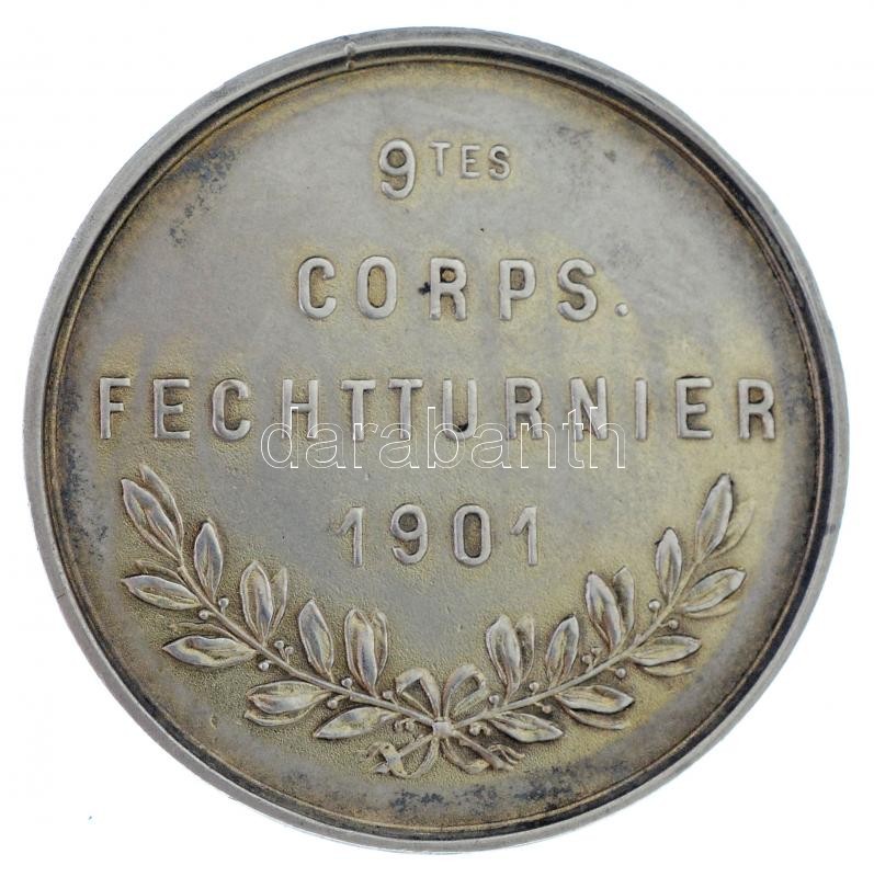 Ausztria 1901. "9tes Corps Fechtturnier" jelzett Ag vívósport emlékérem (9,57g/0.800/30mm) T:1-,2 / Austria 1900. "9tes Corps Fechtturnier" hallmarked Ag fencing sport commemorative medallion (9,57g/0.800/30mm) C:AU,XF