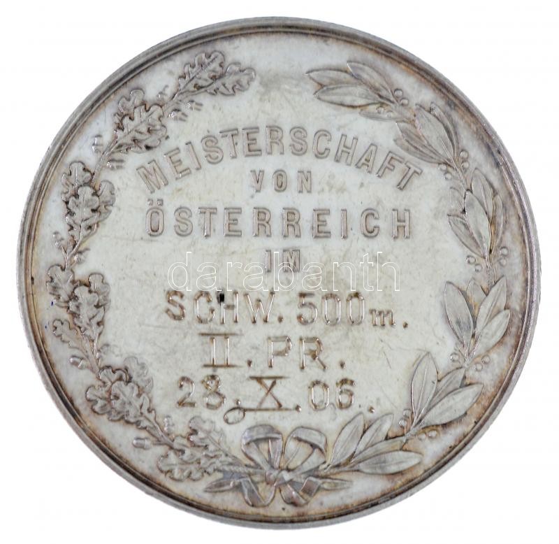 Ausztria 1906. "Österreichischer Schwimmsport Aussuchung / Meisterschaft von Österreich im" jelzett Ag úszó sport emlékérem "Schw. 500m II. PR. 28. X. 06" gravírozással (14,36g/0.800/33mm) T:1- felszíni karcok / Austria 1906. "Österreichischer Schwimmsport Aussuchung / Meisterschaft von Österreich im" hallmarked Ag swimming sport commemorative medallion, with "Schw. 500m II. PR. 28. X. 06" engraving (14,36g/0.800/33mm) C:AU surface scratches