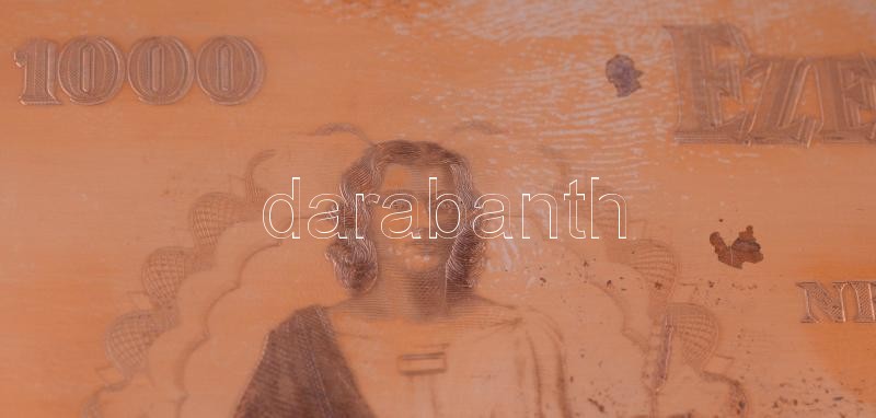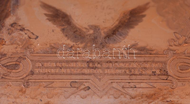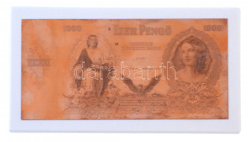 1943. 1000P "Szálasi-kiadás" kiadatlan bankjegy nyomólemez gyártásához készített véset Cu pozitív lemeze (magaslemez)! Horváth Endre tervei alapján (179x86mm). Márvány talapzatra rögzítve. R! / Hungary 1943. 1000 Pengő officialy unissued banknote positive printing plate (179x86mm). Attached to a marble base. RARE!