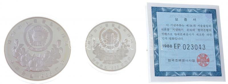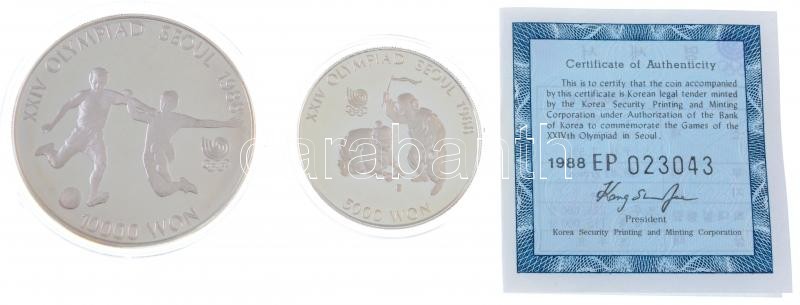 Dél-Korea 1988. 5000W Ag "Búgócsiga" tanúsítvánnyal + 10.000W Ag "Labdarúgás" közös, kopottas dísztokban T:PP / South Korea 1988. 5000 Won Ag "Spinning Top" with certificate + 10.000 Won Ag "Soccer" together in worn display case C:PP Krause KM#71, KM#77