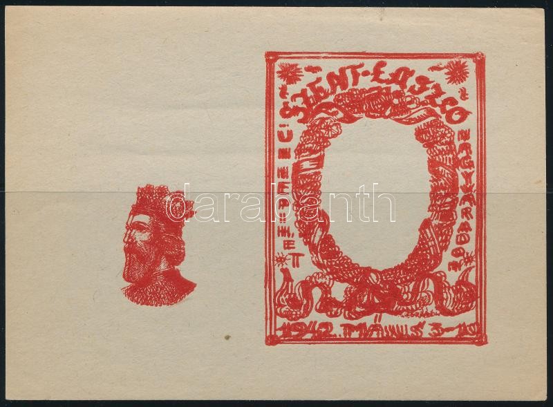 Beschreibung: 1942 Szent László Ünnepi Hét Nagyváradon levélzáró kisív fázisnyomata szürke papíron / phase print of label mini sheet on grey paper