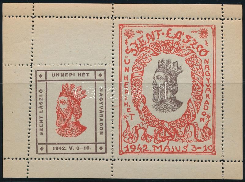 1942 Szent László Ünnepi Hét Nagyváradon levélzáró kisív szürke papíro... https://www.darabanth.com/de/36-Gross-Auktion/36.1/Philatelie-und-Postgeschichte-Ausland/Paraphilatelie~15177/1942-Szent-Laszlo-Unnepi-Het-Nagyvaradon-levelzaro-kisiv-szurke-papiron-label-mini-shee~II2472698
