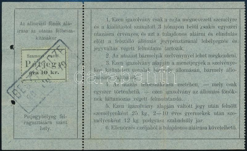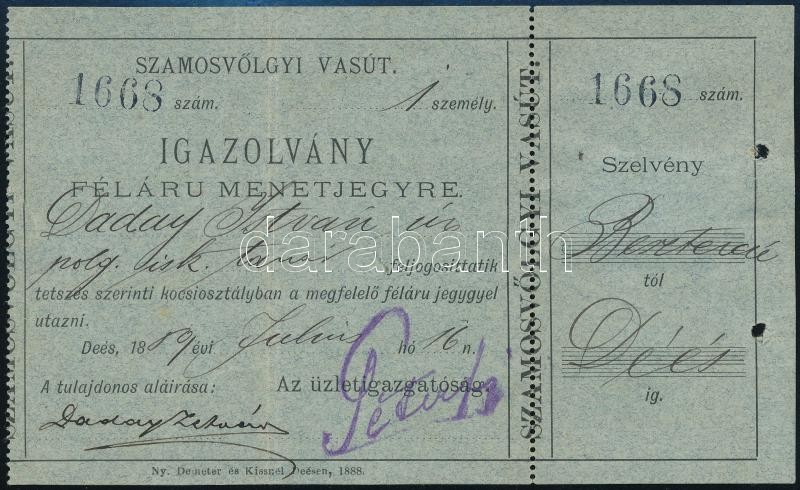1889 Szamosvölgyi vasút igazolvány félárú jegyre. Hátoldalán 10kr pótj... https://www.darabanth.com/de/36-Gross-Auktion/36.1/Philatelie-und-Postgeschichte-Ausland/Stempelmarken~15176/1889-Szamosvolgyi-vasut-igazolvany-felaru-jegyre-Hatoldalan-10kr-potjeggyel-Local-railwa~II2489161