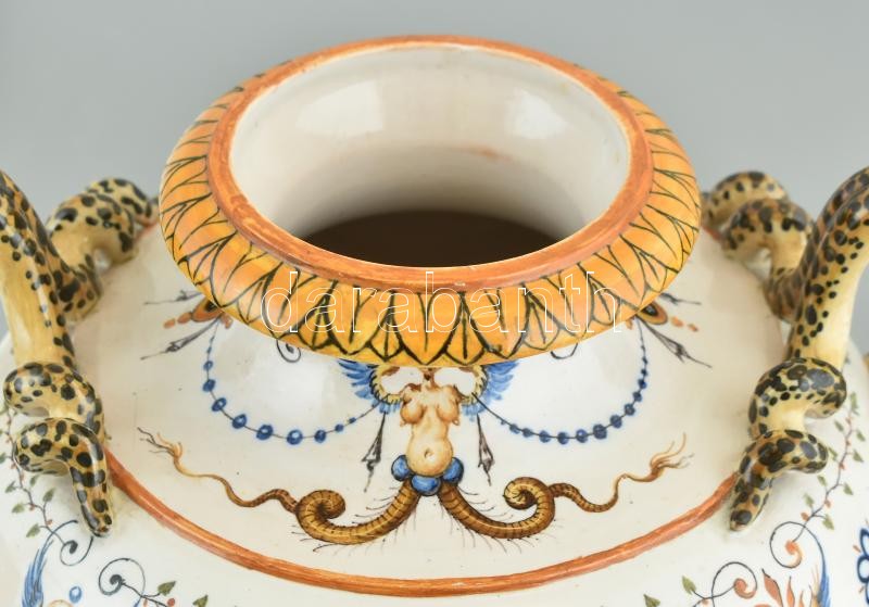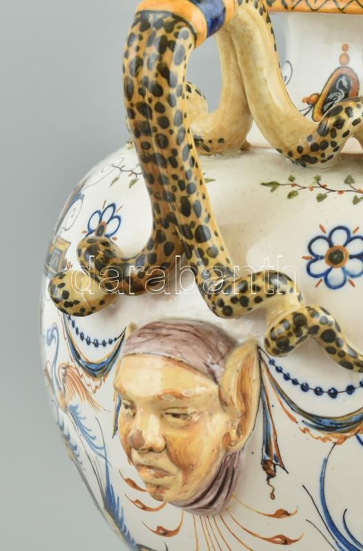 Fajansz, finom ónmázas kerámia, 1880 körül. Fehér, halvány felületén szÃnesen festett maszkaronék, fenevadak, és hattyúk találhatóak. A fogantyúk stilizált kÃgyóként végzÅ‘dnek, alján jelzett. Apróbb csorbákkal. m: 28 cm