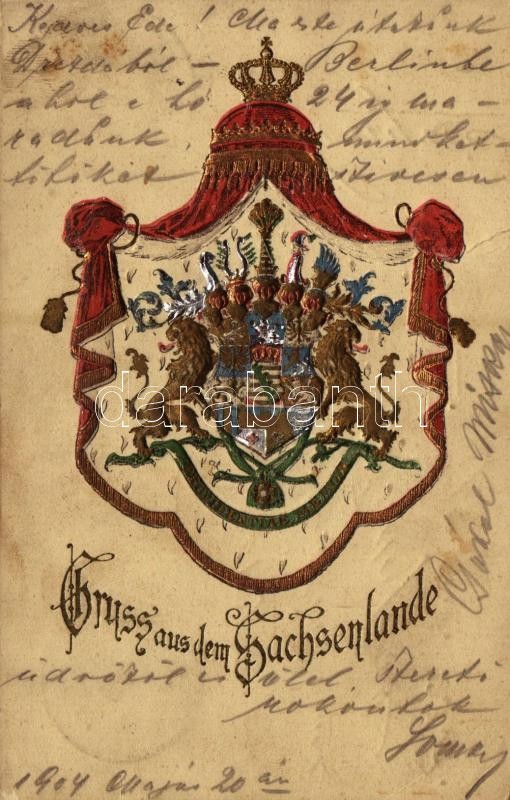 1904 Gruss aus dem Sachsenlande / Coat of Arms of the Kingdom of Saxon... https://www.darabanth.com/de/360-Fernauktion/360.0/Ansichtskarten/Flaggen-Wappen~1000091/1904-Gruss-aus-dem-Sachsenlande-Coat-of-Arms-of-the-Kingdom-of-Saxony-1806-1918-Emb-litho-creas~II2077792