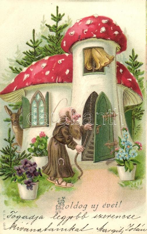 Beschreibung: Boldog Újévet! Újévi dombornyomott litho üdvözlőlap / New Year greeting card, mushroom house with dwarf and deer. Emb. litho