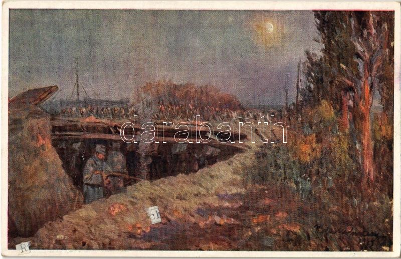 Feierabend im Schützengraben. Der Schauplatz schwerster Kämpfe, die Einbruchsstelle der Russen an der Bahn vor Rowno, bot im sanften Abendschimmer das Bild ruhiger Friedlichkeit. Kriegshilfsbüro Nr. 438. / WWI Austro-Hungarian K.u.K. military art postcard, soldiers in the trenches, artist signed