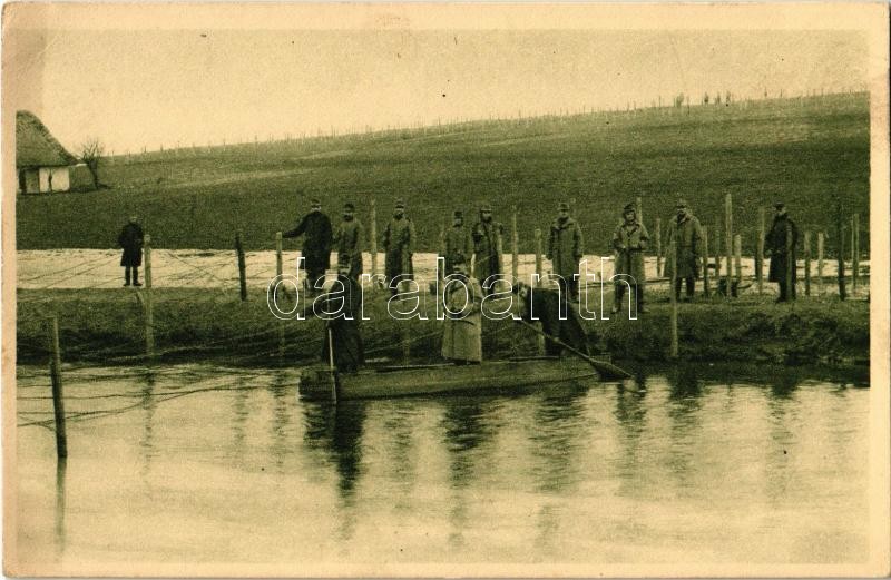 Herstellung von Drahthindernissen über einen Fluss 1916 / Tazení drátenych prekázek pres reku / WWI Austro-Hungarian K.u.K. military, making wire barriers over the river (EK)