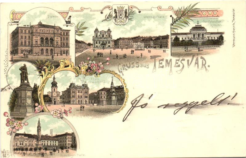 1898 Temesvár, Timisoara; színház, Losonczy tér, Józsefvárosi zárda, Gyárvárosi Kossuth tér, Scudier szobor, Prinz Eugen tér, Uhrmann Henrik üzlete és saját kiadása / theatre, squares, statue, nunnery, shop. floral litho