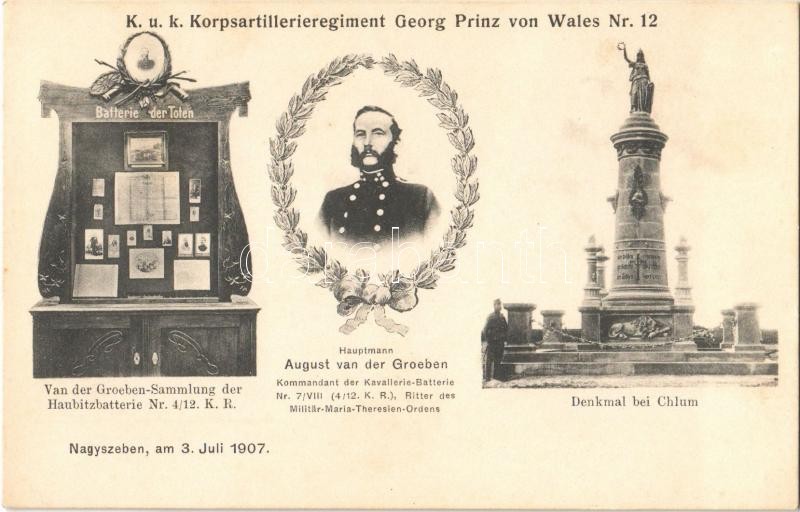 1907 Nagyszeben, Hermannstadt, Sibiu; Cs. és kir. 12. sz. Georg Prinz von Wales hadtest-tüzérezred, August van der Groeben vezérőrnagy és a 4/12-es tarack osztag emlék gyűjteménye, emlékmű Chlumnál / K.u.K. Korpsartillerieregiment Georg Prinz von Wales Nr. 12., August van der Groeben, Van der Groeben-Sammlung der Haubitzbatterie Nr. 4/12. K.R., Denkmal bei Chlum / K.u.K. military artillery regiment and its statue and memorial collection