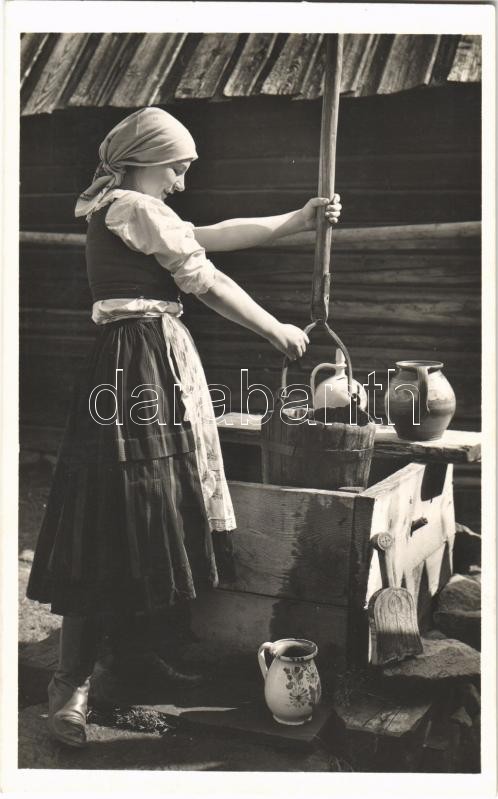 Beschreibung: Csíkszenttamás, Tomesti; lány a kútnál, folklór. Andory Aladics Zoltán mérnök felvétele / girl at the well, folklore