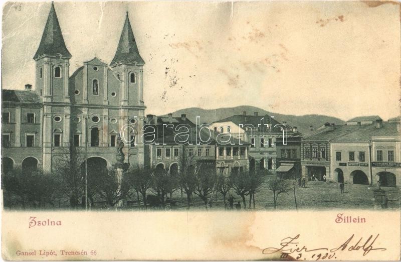 1900 Zsolna, Sillein, Zilina; Árvaházi templom, Fő tér, Fonciere Pesti Biztosító Intézet ügynöksége, Tatár József üzlete / main square, church, shops, insurance company (Rb)