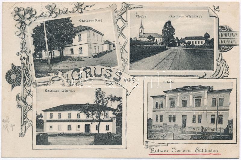 1909 Radkov, Ratkau; Gasthaus Frei, Kirche, Gasthaus Wladarsch, Gasthaus Wilscher, Schule / inns, hotels, church, school. Art Nouveau, floral (wet damage)