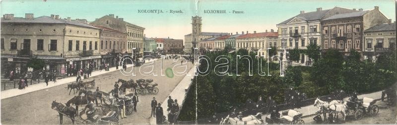 Beschreibung: 1915 Kolomyia, Kolomyja, Kolomyya, Kolomea; Rynek. Wydawn. G. Gottlieba w Kolomyi 1910. / Piac tér, üzletek, bank. kihajtható lap / marketplace, shops, bank. folding card