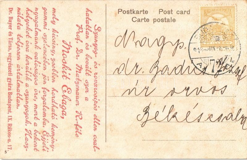 Beschreibung: 1913 Budapest I. Dunai látkép a várral. Hátoldalon Prof. Dr. Matzenhauer R.-féle Moskit Ebaga reklám Dr. Bayer és Társa vegyészeti gyártól