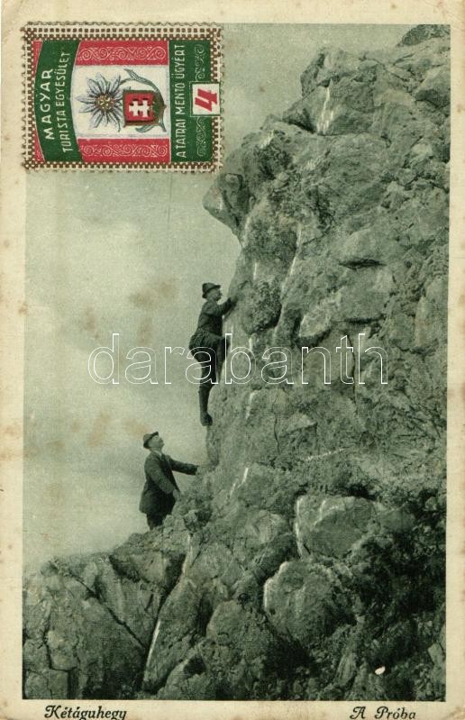 1923 Pilis, Kétágú-hegy, turisták, hegymászók. Fényképezte Bekey Imre Gábor. A Magyar Turista Egyesület kiadása + "Magyar Turista Egyesület a tátrai mentő ügyért" bélyeg (fl)