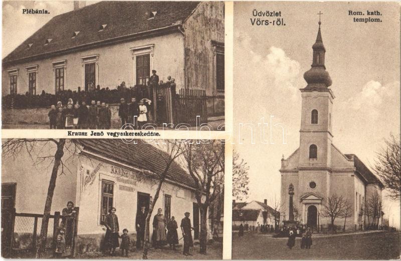 1928 Vörs, Plébánia, Római katolikus templom, Krausz Jenő üzlete. Kálm... https://www.darabanth.com/de/360-Fernauktion/360.0/Ansichtskarten/Ungarn~1000005/1928-Vors-Plebania-Romai-katolikus-templom-Krausz-Jeno-uzlete-Kalman-fenykepesz~II2072975