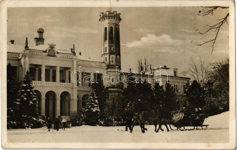 Beschreibung: Füzérradvány, Radvány; Kastély Szálló (Gróf Károlyi László kastélya) télen, síelők, lovasszán