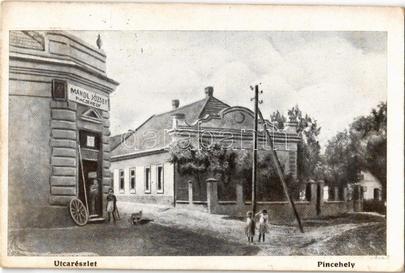 Beschreibung: Pincehely, utcakép, Mandl József üzlete (apró szakadás / tiny tear)