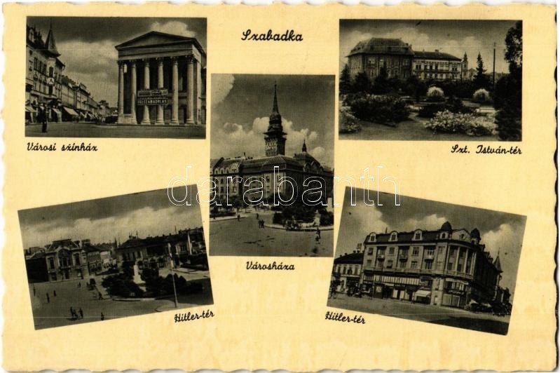 Szabadka, Subotica; Városi színház, Szt. István tér, városháza, Hitler... https://www.darabanth.com/de/360-Fernauktion/360.0/Ansichtskarten/Vojvodina~1000011/Szabadka-Subotica-Varosi-szinhaz-Szt-Istvan-ter-varoshaza-Hitler-ter-theatre-town-h~II2038738