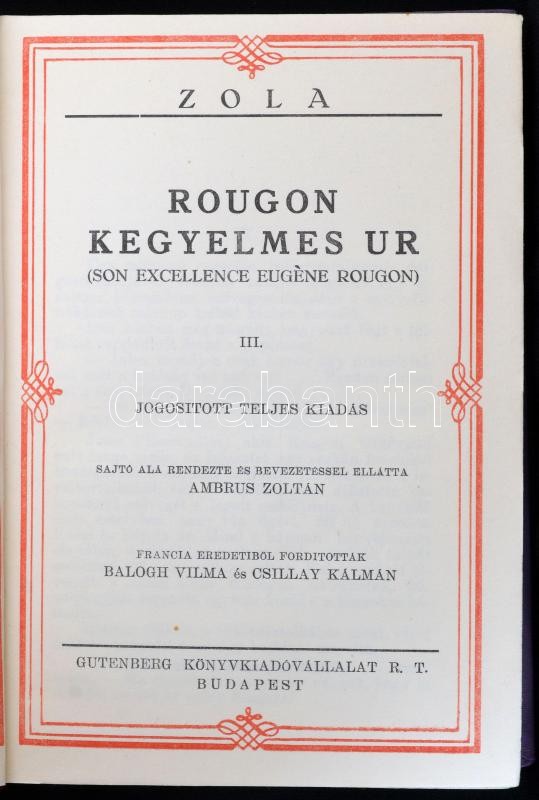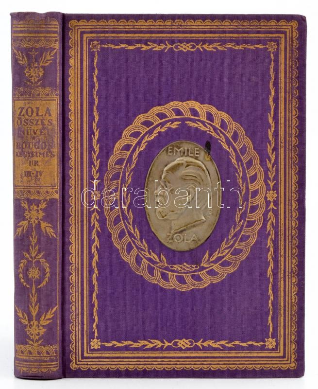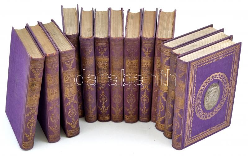 A Zola összes művei 13 kötete: A föld 1-2.; A föld 3-4.; Az élet öröme I-II.,; Az élet öröme. Tanulmányok.; A pénz. I-II..; A pénz III. ; A zsákmány I-II.; A mestermű.; Rougon kegyelmes ur. III.; Az emberirtó II.; Páris gyomra III.; A zsákmány III.; Plassans meghódítása. III. Bp., é.n., Gutenberg. Bp., é.n., Christensen és Társa-Gutenberg Könyvkiadó Vállalat. Kiadói aranyozott egészvászon sorozatkötésben, a kötéstáblákon a szerző plakettjével, a plakettet Beck Ö. Fülöp szobrászművész tervezte, változó állapotban, kopottas borítókkal.