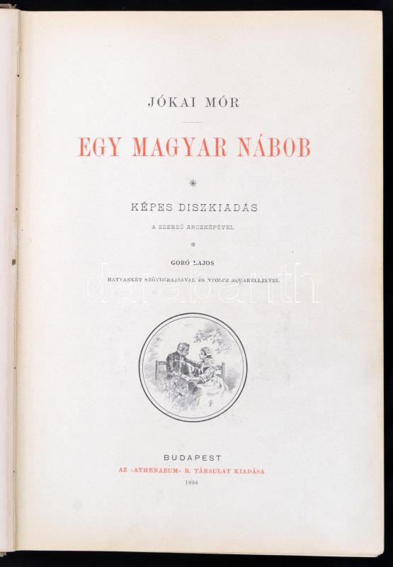 Jókai Mór: Egy magyar nábob. Képes díszkiadás. Goró Lajos hatvankét szövegrajzával, és nyolc aquarelljével. Bp., 1894, Athenaeum, 1 t.+XII+500+2 p.+ 8 t. Kiadói aranyozott, dombornyomásos egészvászon-kötésben, kissé kopott borítóval, és kissé sérült és kissé kopott gerinccel és borítóval, egy tábla kijár.