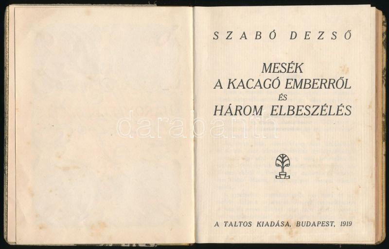 Szabó Dezső: Mesék a kacagó emberről és három elbeszélés. Bp., 1919. Táltos. Első kiadás. Korabeli aranyozott gerincű félbőr és selyem amatőr kötés, aranyozott lapélekkel, kézzel rajzolt, díszes címlappal, kopottas selyem tokban, néhol foltos lapokkal.