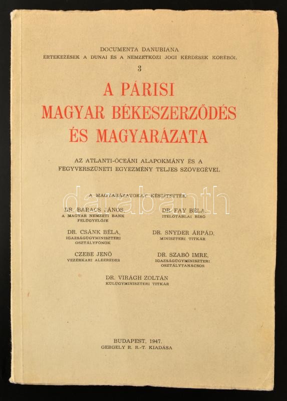 A Párisi Magyar Békeszerződés és Magyarázata. Az atlanti-óceáni alapokmány és a fegyverszüneti egyezmény teljes szövegével. Documenta Danubiana 3. Bp.,1947, Gergely R. Rt., 82 p. Kiadói papírkötésben.