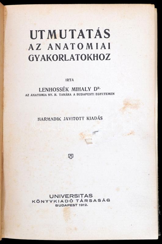 Dr. Lenhossék Mihály: Útmutatás az anatómiai gyakorlatokhoz. Bp.,1912, Universitas, VIII-9-278 p. Harmadik, javított kiadás. Kiadói egészvászon-kötés, a címlapon kis lyukkal.