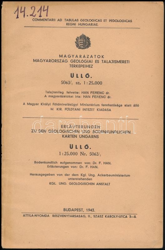 Üllő. Magyarázatok Magyarország geológiai és talajismereti térképeihez. Talajtanilag felvette és a magyarázatokat írta: Dr. Han Ferenc. Bp.,1943, M. Kir. Földtani Intézet,(Attila-ny.), 40 p. Magyar és német nyelven. Kiadói papírkötés, intézményi bélyegzővel.