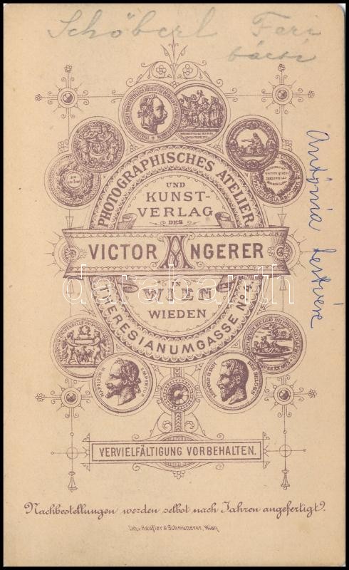 Beschreibung: cca 1877 Schöberl Ferencről készült, feliratozott, vizitkártya méretű, vintage fotó, Victor Angerer bécsi műterméből, 10,9x6,6 cm