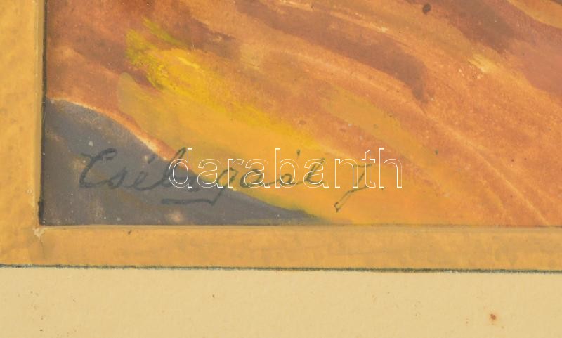 Beschreibung: Csébi Gaál József (?-): Dobos táj. Akvarell, papír, üvegezett keretben, 21×29 cm