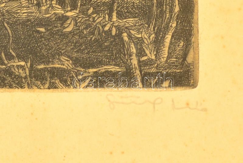 Beschreibung: Görög Rezső (1930- ): Erdő szélen. Rézkarc, papír, jelzett, üvegezett keretben, 29,5×39 cm